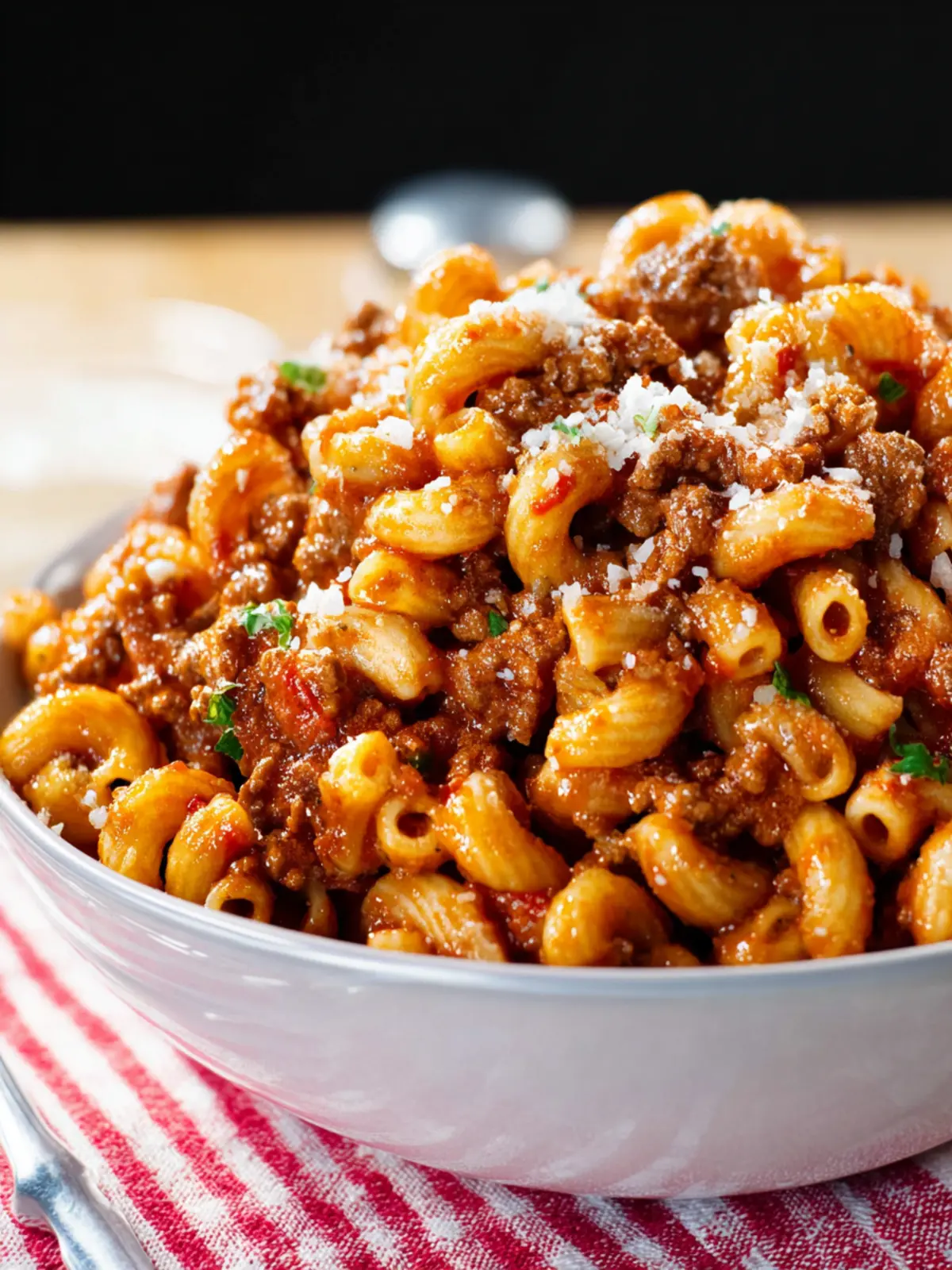 Sprinkle shredded mozzarella or cheddar on top just before serving. It melts into a deliciously gooey layer, elevating your Homemade Beefaroni with a cheesy finish.