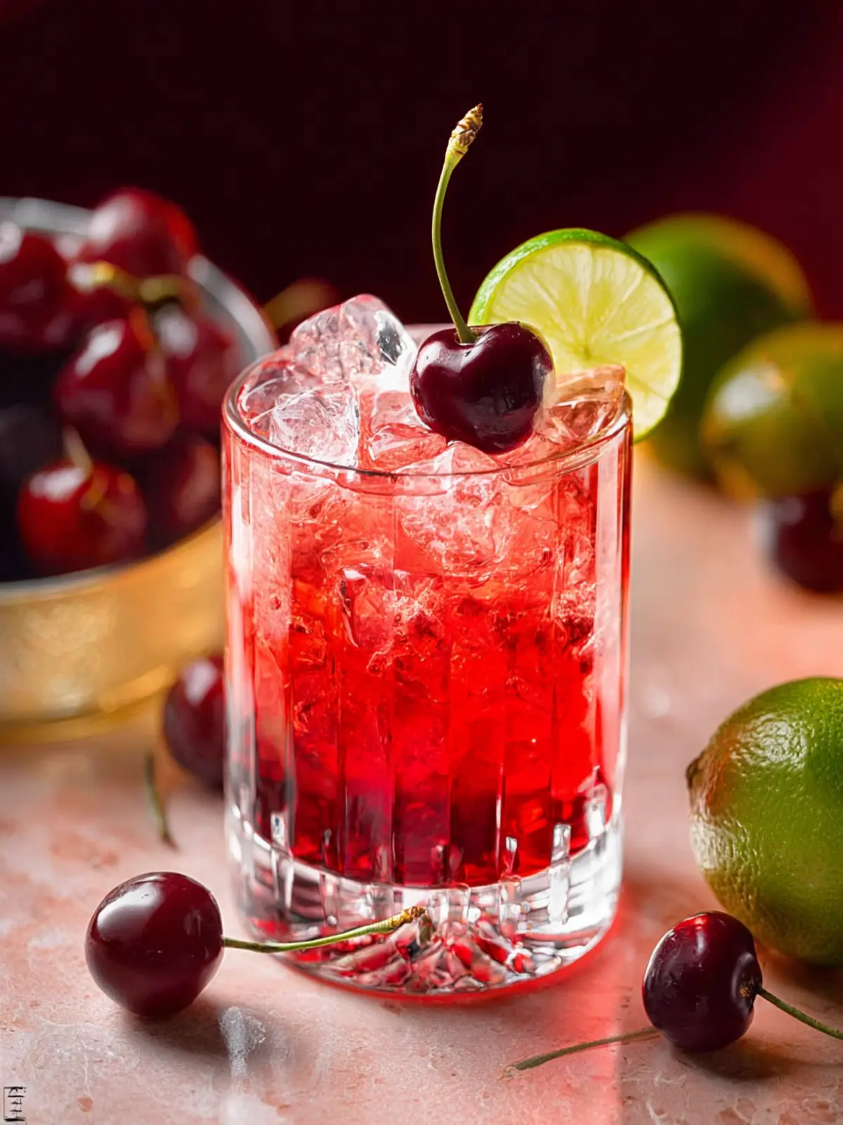 A refreshing drink made with ginger ale, lime juice, and grenadine, garnished with maraschino cherries.